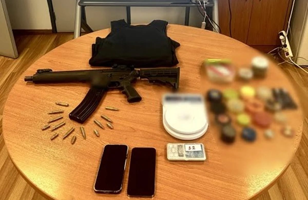 Κατά τη διάρκεια της εφόδου, βρέθηκαν και κατασχέθηκαν ένα αυτόματο πυροβόλο όπλο με εννέα σφαίρες, ένα αλεξίσφαιρο γιλέκο, επιπλέον πέντε φυσίγγια, ένα ζευγάρι πλαστές πινακίδες κυκλοφορίας, πλαστή ελληνική ταυτότητα, δύο επίσημες σφραγίδες, τέσσερις σφραγίδες επιχειρήσεων, ποσότητα κοκαΐνης, μαριχουάνας, δύο ζυγαριές ακριβείας, δεκάξι τρίφτες κάνναβης και δύο φορητοί υπολογιστές.