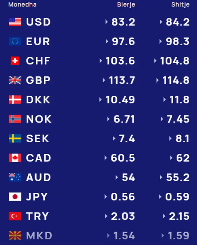 Στην σημερινή αλβανική αγορά συναλλάγματος, το αμερικανικό δολάριο αγοράζεται με 83,2 λεκ και πωλείται με 84,2 λεκ. Το ευρώ αγοράζεται με 97,6 λεκ και πωλείται με 98,3 λεκ. Το ελβετικό φράγκο αγοράζεται με 103,6 λεκ και πωλείται με 104,8 λεκ. Η βρετανική λίρα αγοράζεται με 113,7 λεκ και πωλείται με 114,8 λεκ.